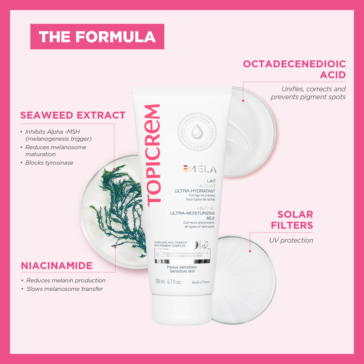 MELA Unifiying Ultra-Hydrating Milk , No. 1 anti-dark spot milk* , moisturizes 24 hours** and evens the skin. The combination of the MELA complex*** with a unifying active ingredient offers corrective action on established pigment spots on the body. The composition of the Ultra-Moisturizing Anti-Dark Spot Unifying Milk in sun filters offers SPF15 protection which helps prevent the appearance of new hyperpigmentations . Its light and pleasant texture offers comfort and intense hydration. Tested under dermatological control on light to dark skin types.