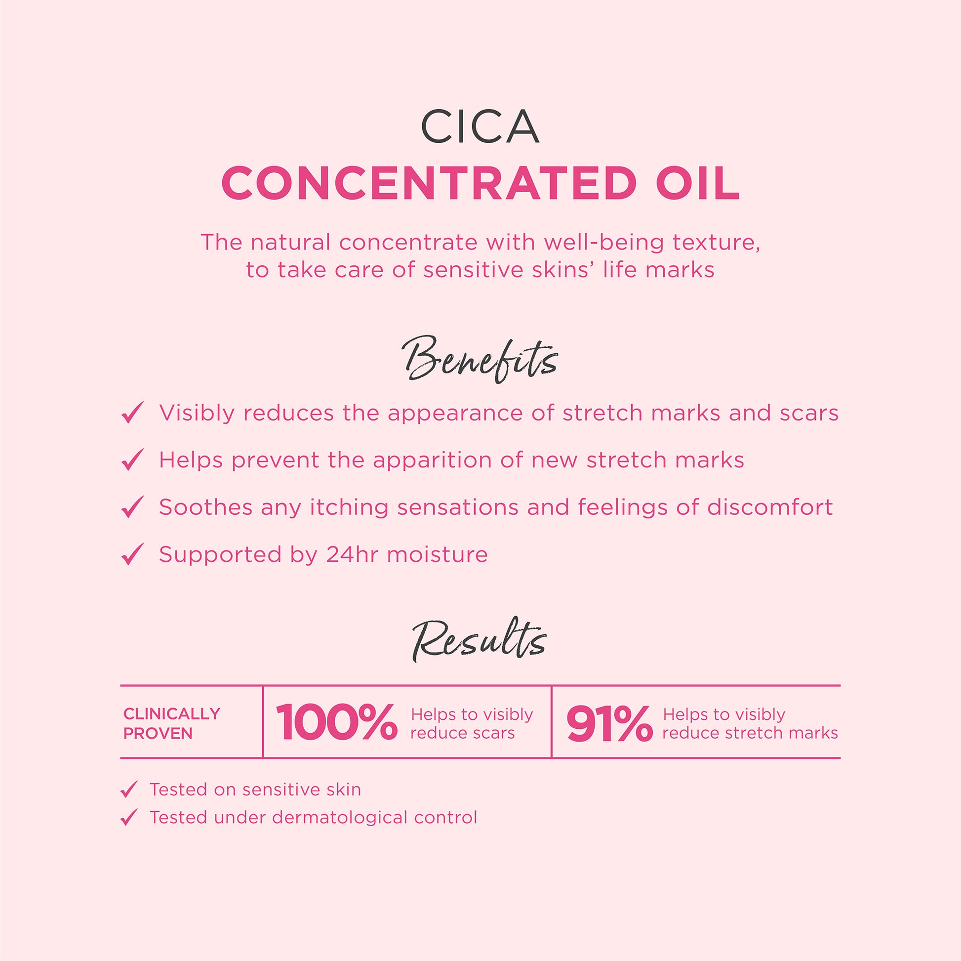 Concentrated of 3 oils (Maracuja, Sweet Almond and Camelina), CICA+ Concentrated Oil with 99.8% natural ingredients visibly reduces the appearance of stretch marks and scars (size and color). Our anti-stretch mark oil helps prevent the appearance of new stretch marks by firming the skin. Our oil against stretch marks and scars soothes any sensation of itching, tightness and discomfort, while moisturizing for 24 hours*. Its well-being oil texture with a non-greasy and non-sticky finish and a very mild fragrance helps providing an optimal massage of stretch marks and scars and takes care of sensitive skin at all stages of life. Child, adults. Suitable for breastfeeding and pregnant women from the 1st trimester. Dermatologically tested.